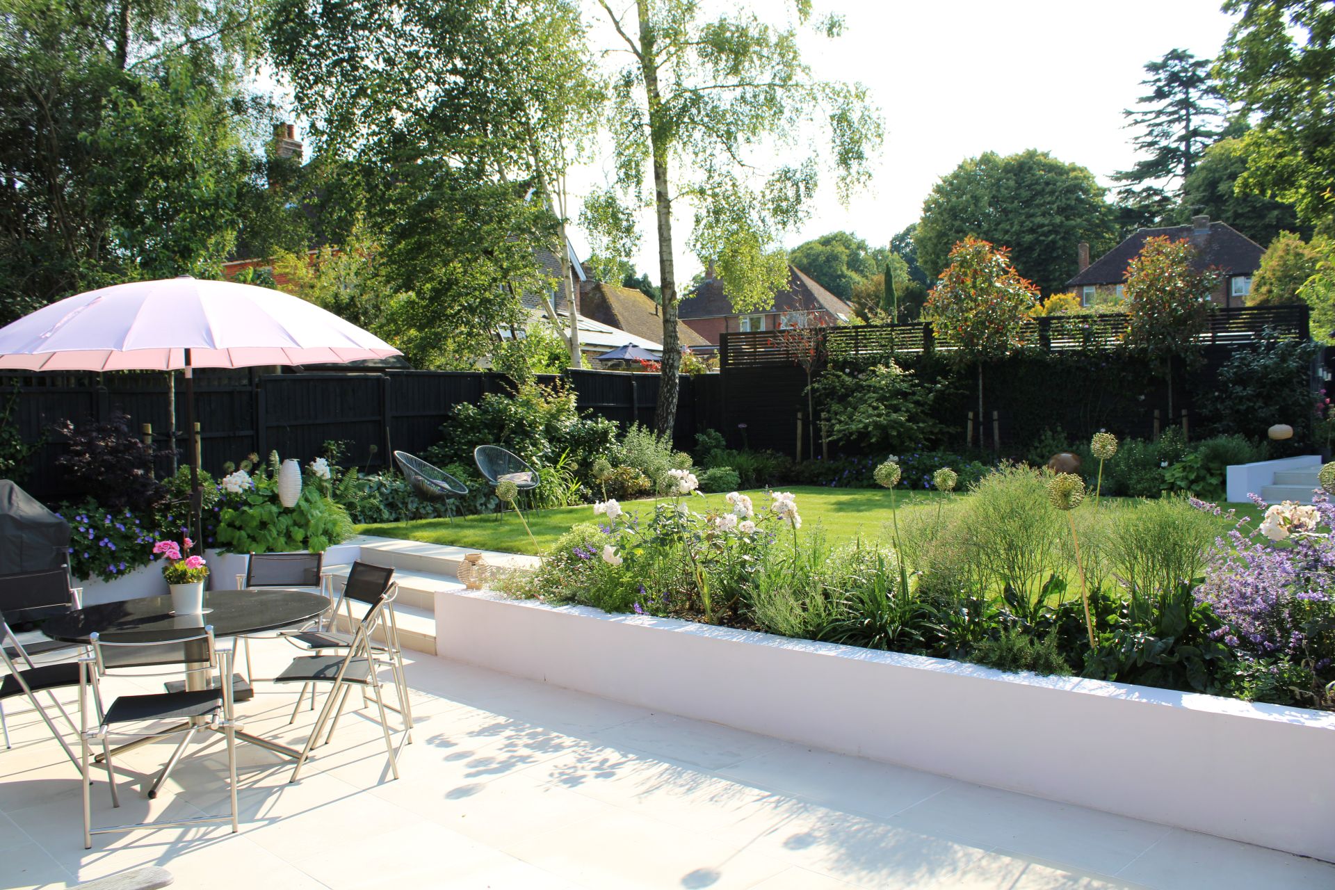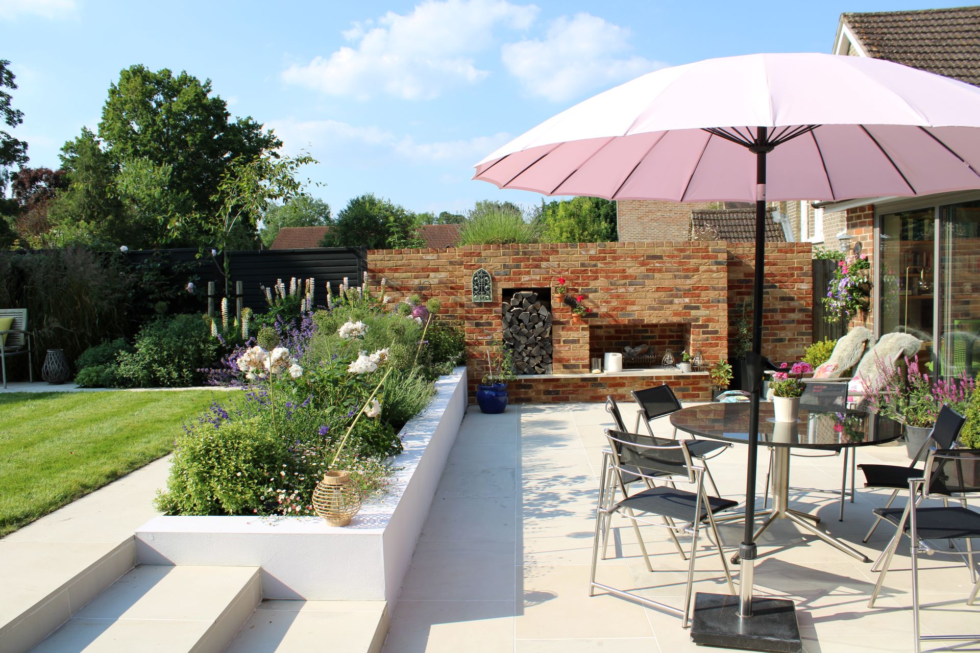 A tired and overgrown garden was in need of a total overhaul to create the modern garden space the clients had always wanted. By taking out the boundary hedge we were able to open up the garden and gain a huge amount of space making the whole garden feel twice as big. The fire place feature is the main focal point of the scheme with the Water Feature and other seating areas providing the perfect backdrop to the softer, colourful planting.